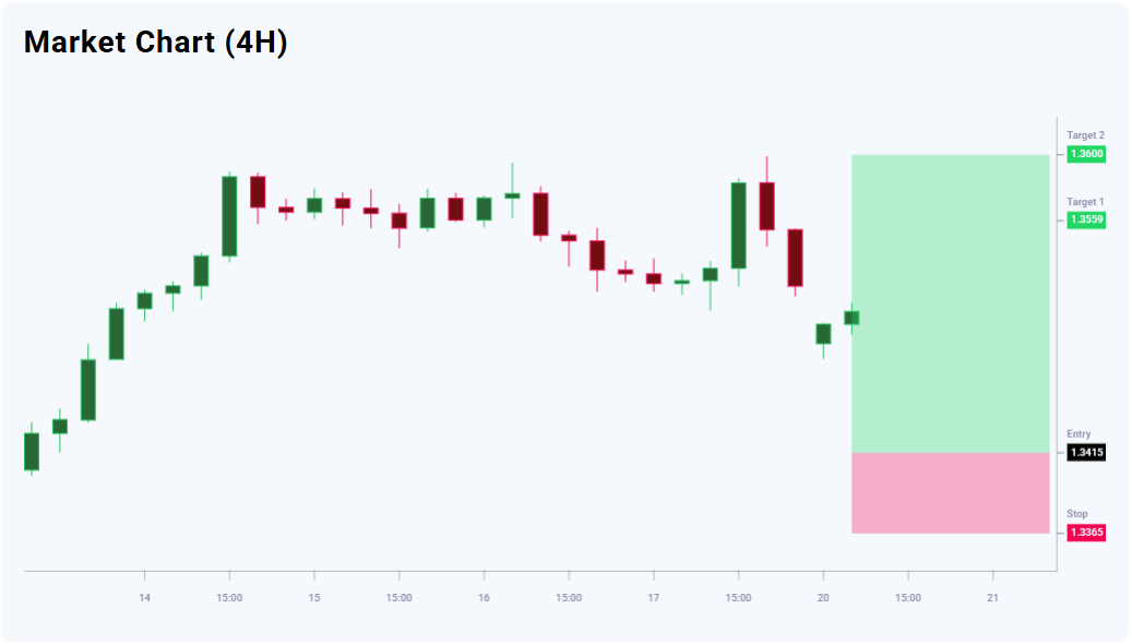 ข้อมูลข่าวสำหรับ GBPUSD ยังไม่แสดงความได้เปรียบชัดเจนของฝั่งใด (50% เทียบกับ 50%) แต่ภาพทางเทคนิคชี้ว่าราคามีโอกาสปรับขึ้นต่อหลังการปรับฐาน ดีลนี้ถือว่าน่าสนใจในระดับปานกลางในแง่อัตราส่วนความเสี่ยงต่อผลตอบแทน การวางคำสั่ง Buy Limit ที่ 1.3415 ช่วยให้เข้าที่ราคาที่เหมาะสมก่อนการเคลื่อนไหวขึ้นที่คาดการณ์ไว้ เป้าหมายแรกที่ 1.3559 ให้ศักยภาพกำไร 144 pips และเป้าหมายที่สองที่ 1.3600 เพิ่มศักยภาพกำไรเป็น 185 pips จุดตัดขาดทุนที่ 1.3365 จำกัดความเสี่ยงไว้ที่ 50 pips ซึ่งคิดเป็นอัตราส่วนประมาณ 1:2.9 สำหรับเป้าหมายแรก และ 1:3.7 สำหรับเป้าหมายที่สอง