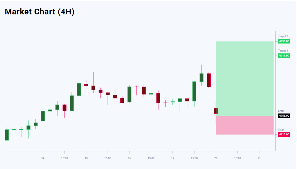 บริเวณ 4,913.00 เป็นจุดที่มีการบรรจบของระดับ Fibonacci หลายเส้น ทำให้เป็นระดับอ้างอิงทางเทคนิคที่สำคัญสำหรับเป้าหมาย ขณะที่แนวรับอยู่ที่ 4,758.00 จากความคาดหวังการปรับขึ้นต่อ กลยุทธ์หลักคือการเปิดสถานะซื้อ